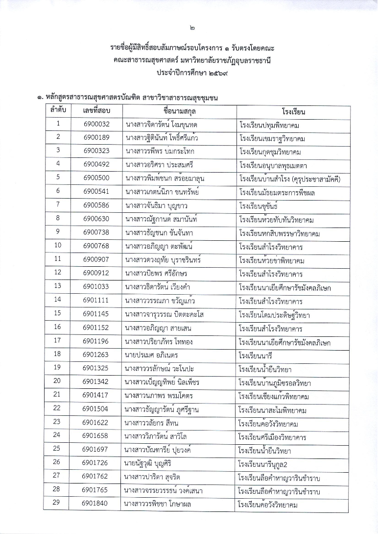 ประกาศชื่อผู้ผ่านการคัดเลือกและมีสิทธิ์สอบสัมภาษณ์ รอบโครงการ 1 (รับตรงโดยคณะ) ประกาศชื่อผู้ผ่านการคัดเลือกและมีสิทธิ์สอบสัมภาษณ์ นักศึกษาใหม่ ระดับปริญญาตรี ภาคปกติ ปีการศึกษา 2569 คณะสาธารณสุขศาสตร์ มหาวิทยาลัยราชภัฏอุบลราชธานี รอบโครงการ 1 (รับตรงโดยคณะ)