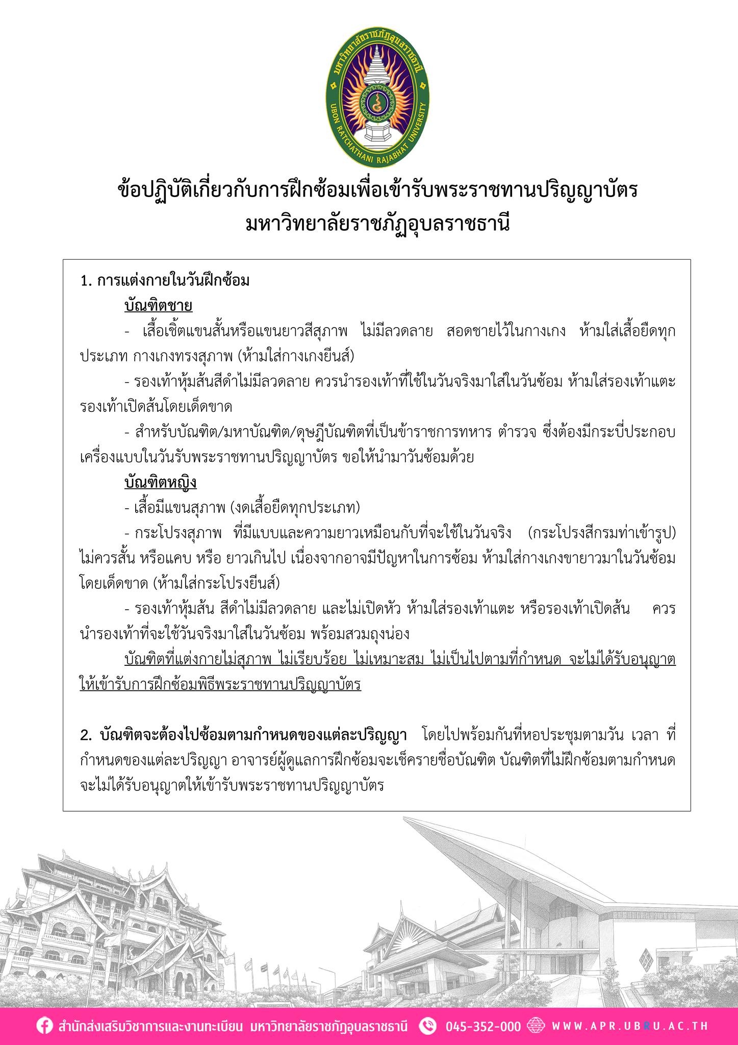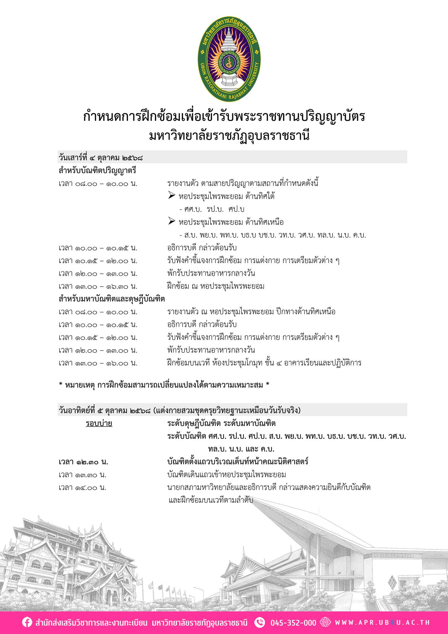 แจ้งกำหนดการเข้ารับพระราชทานปริญญาบัตร ประจำปีการศึกษา 2566 แจ้งกำหนดการเข้ารับพระราชทานปริญญาบัตร สำหรับบัณฑิต ปริญญาตรี ปริญญาโทและปริญญาเอก สำเร็จการศึกษาประจำปีการศึกษา 2566 —————————————– ลงทะเบียนในระบบ : 3 – 30 กันยายน 2568 ร่วมพิธีซ้อม : 4 – 5 ตุลาคม 2568 ร่วมพิธีพระราชทานปริญญาบัตร : 11 ตุลาคม 2568 —————————————– ติดต่อสอบถามรายละเอียดโทร 045 352 145 หรือ 045 352 146 ระบบลงทะเบียน https://bunditubru.ubru.ac.th/ ตรวจสอบรายชื่อบัณฑิตได้ที่ apr.ubru.ac.th