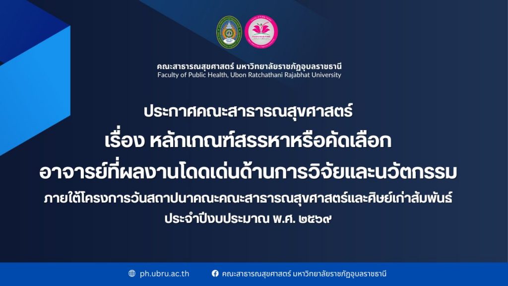 ประกาศคณะสาธารณสุขศาสตร์ เรื่อง หลักเกณฑ์สรรหาหรือคัดเลือกอาจารย์ที่ผลงานโดดเด่นด้านการวิจัยและนวัตกรรม ภายใต้โครงการวันสถาปนาคณะคณะสาธารณสุขศาสตร์และศิษย์เก่าสัมพันธ์ ประจำปีงบประมาณ พ.ศ. ๒๕๖๙